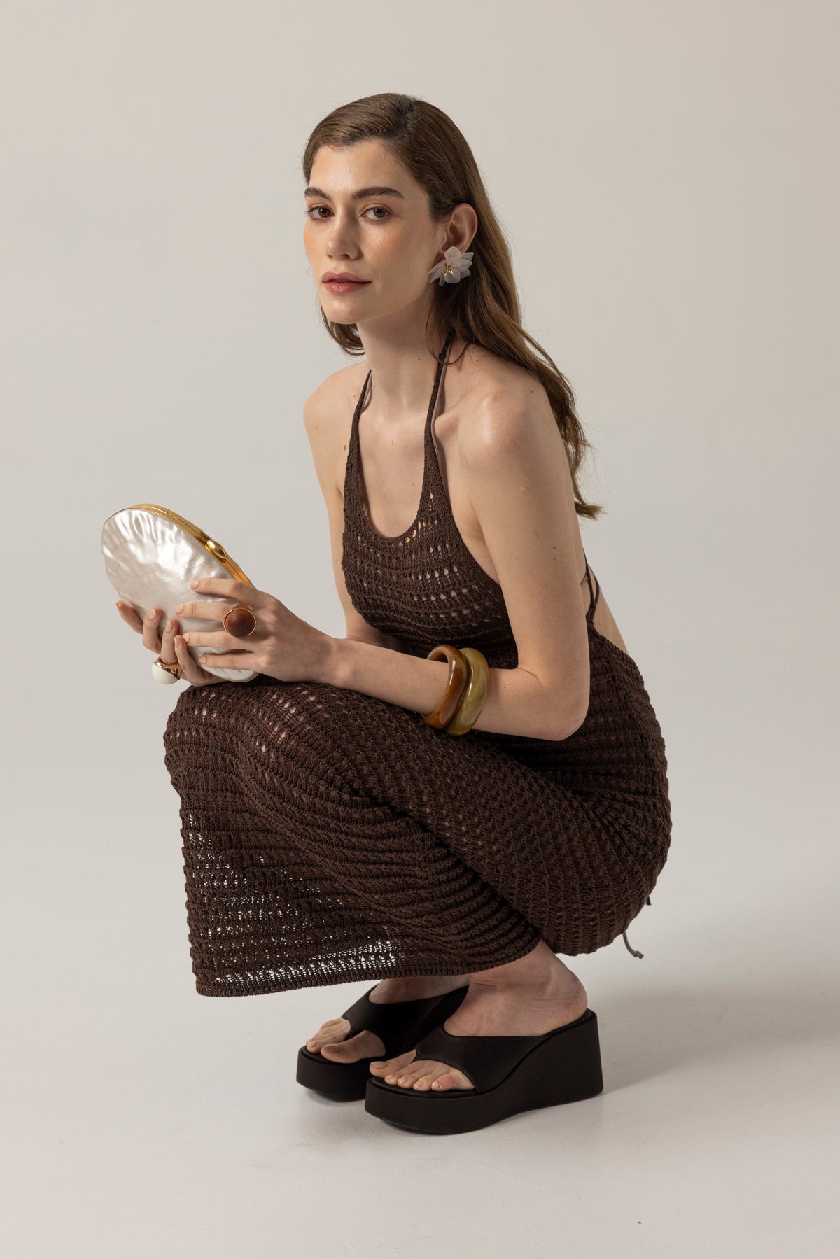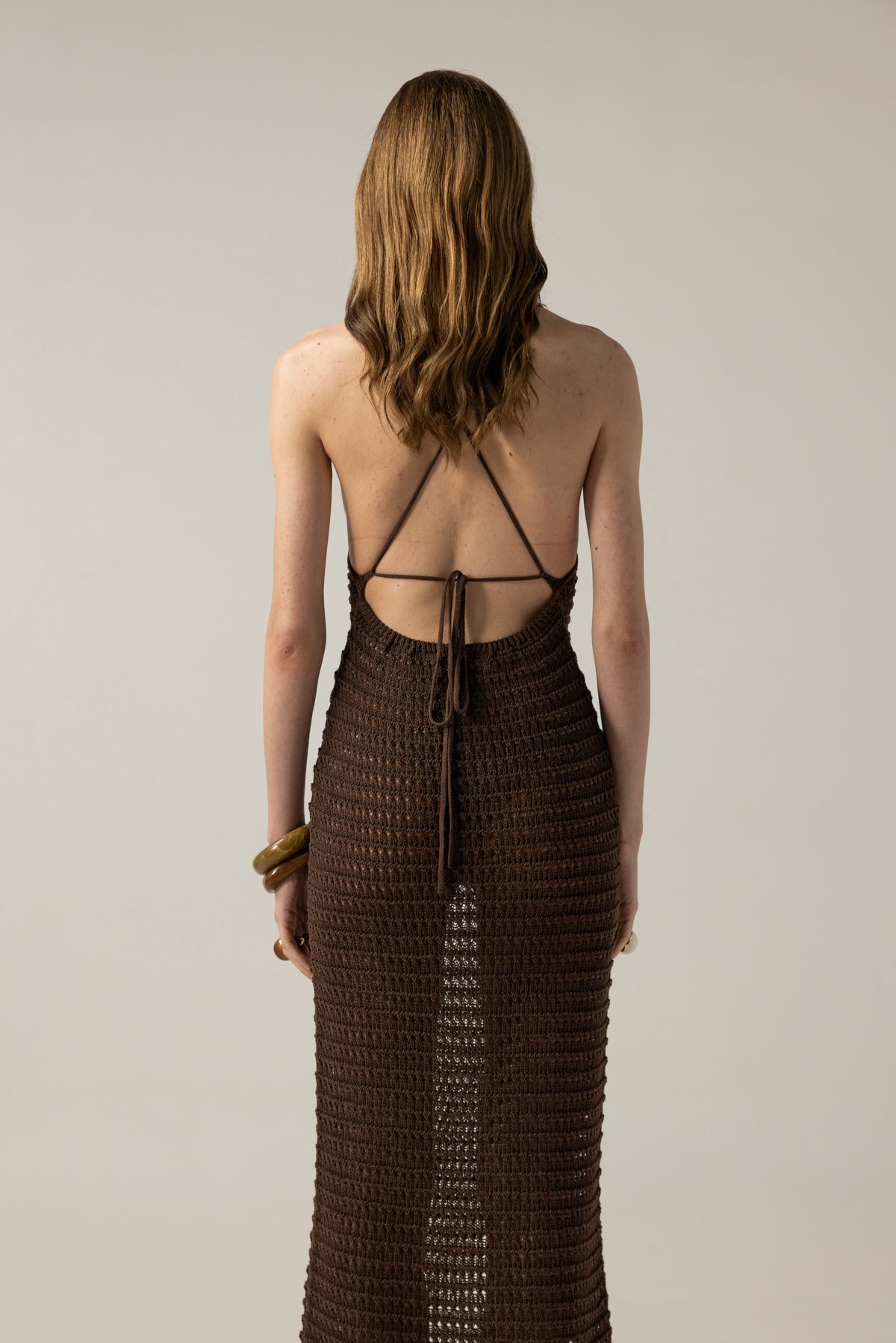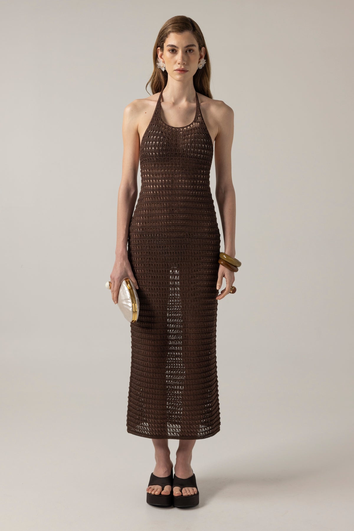 El örgüsü file dokusuyla nefes alan bu kahverengi triko midi elbise, minimal yapısına rağmen yüksek bir duruş sergiler. İnce halter yaka kesimi ve sırt dekoltesiyle göz alırken, plaj üstü ya da şehir şıklığında giyilebilecek kadar çok yönlü.