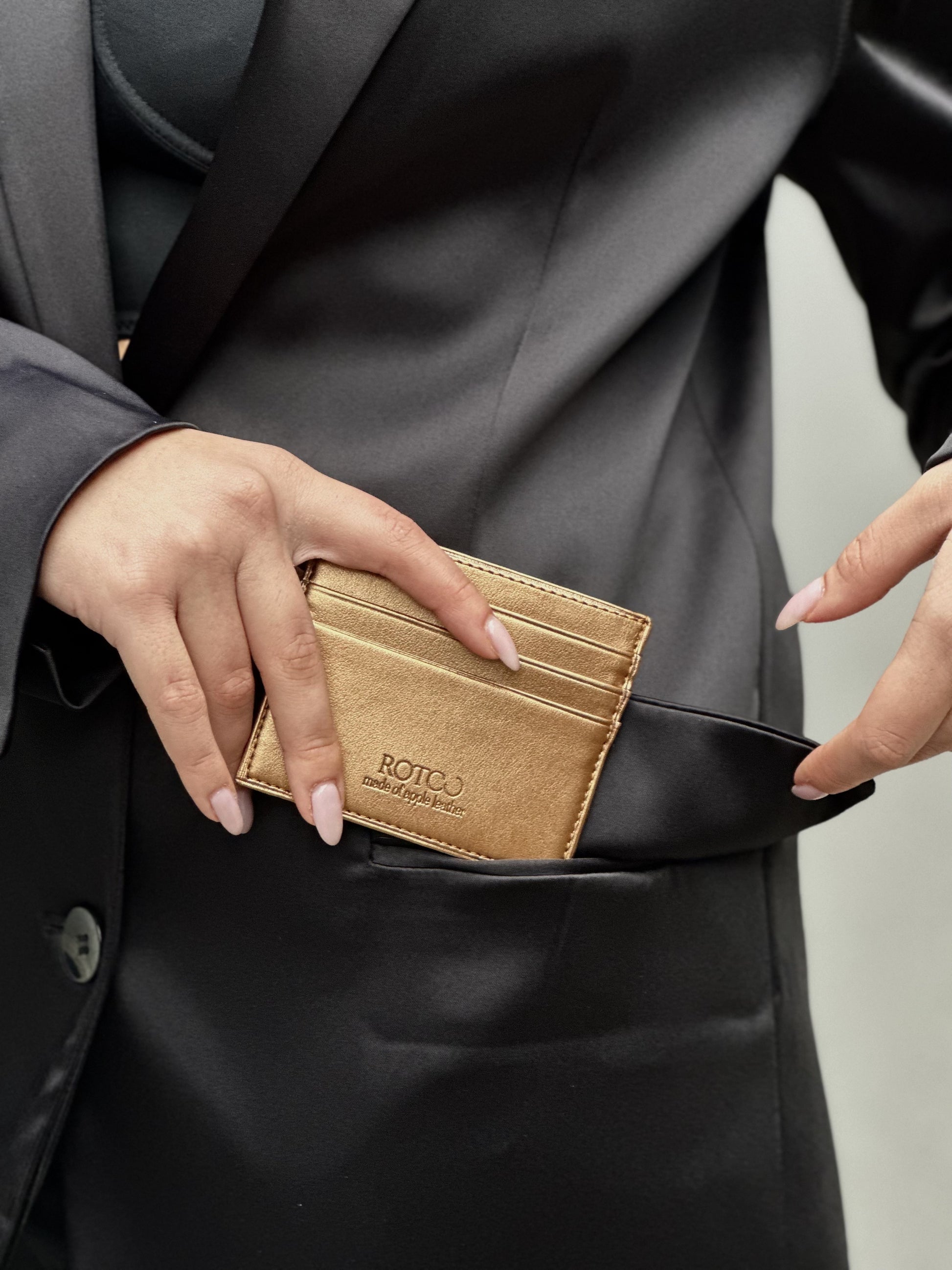 Rotco Gold Kartlık ve Vegan Gold Cardholder, sadece kartlarınızı deri kartlık şeklinde saklamakla kalmaz, Rotco stilinizi yansıtan organik ve vegan aksesuar olma özelliği taşır. Bitkisel deri aksesuarın eşsiz dokusu, eko vegan kartlıkları tamamlar ve kullanıcısına organik kaliteli kartlık duygusunu hissettirir.