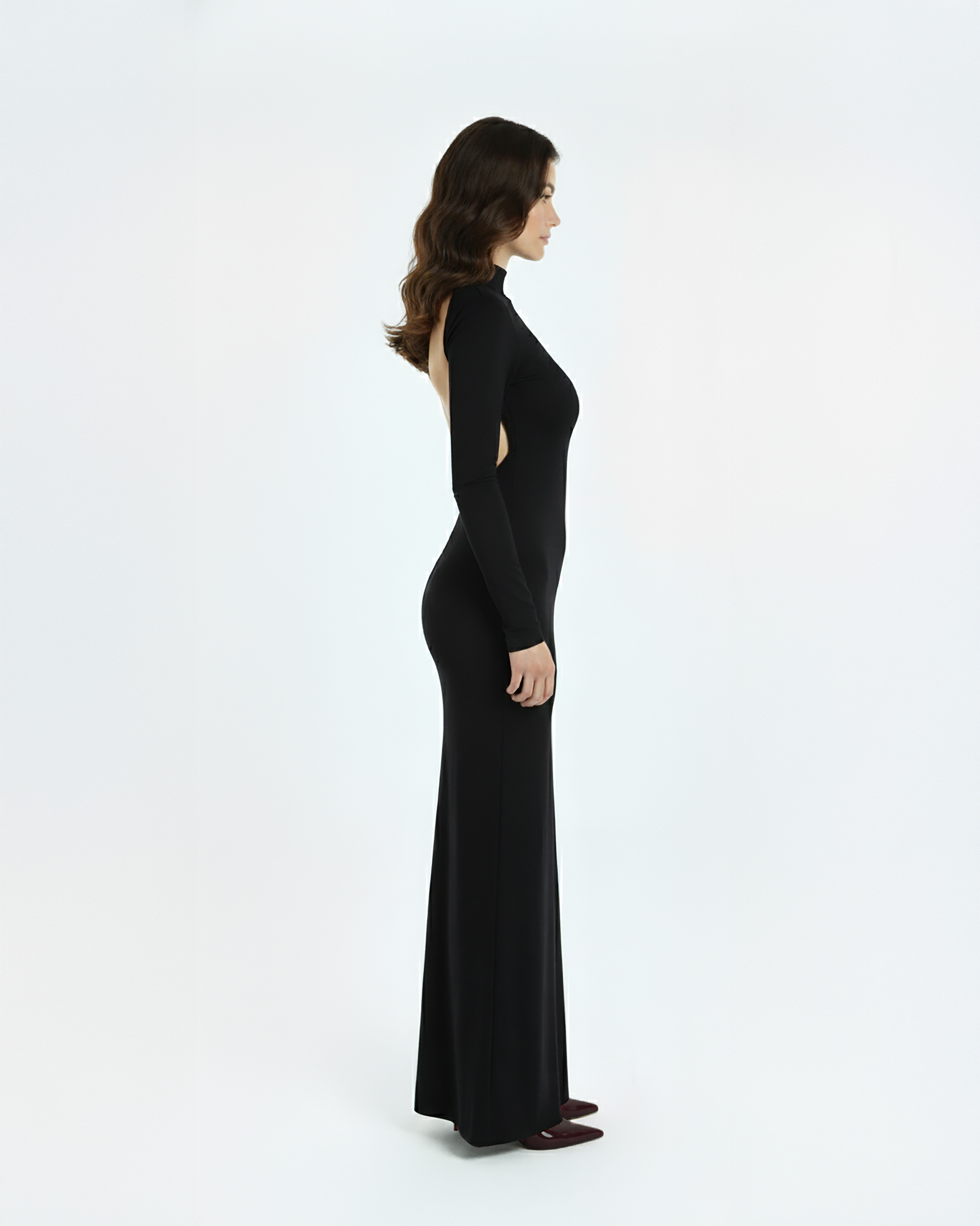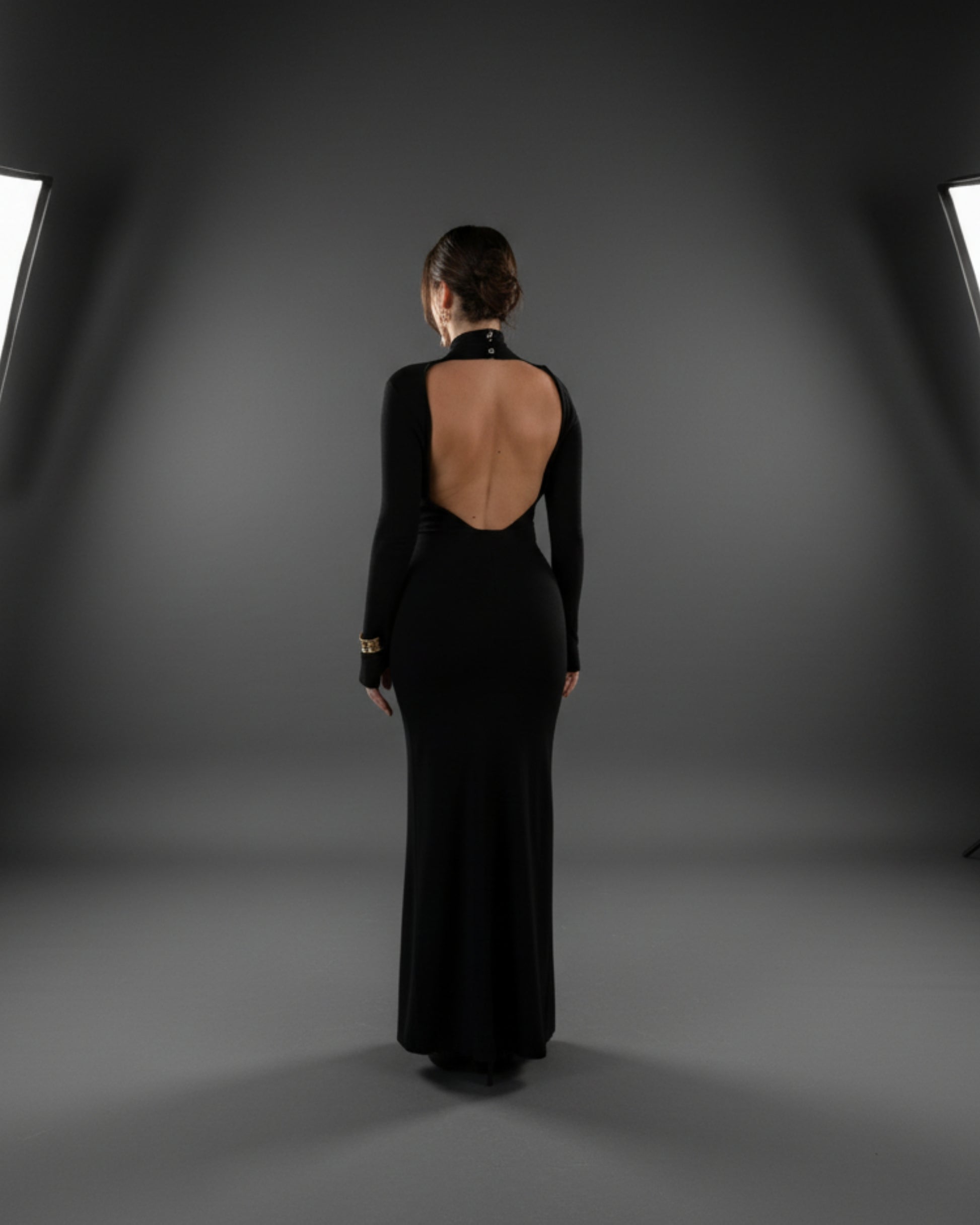 Yüksek yakası güçlü bir duruş kazandırırken, tamamen açık sırt detayı sade şıklığa etkileyici bir kontrast ekler.