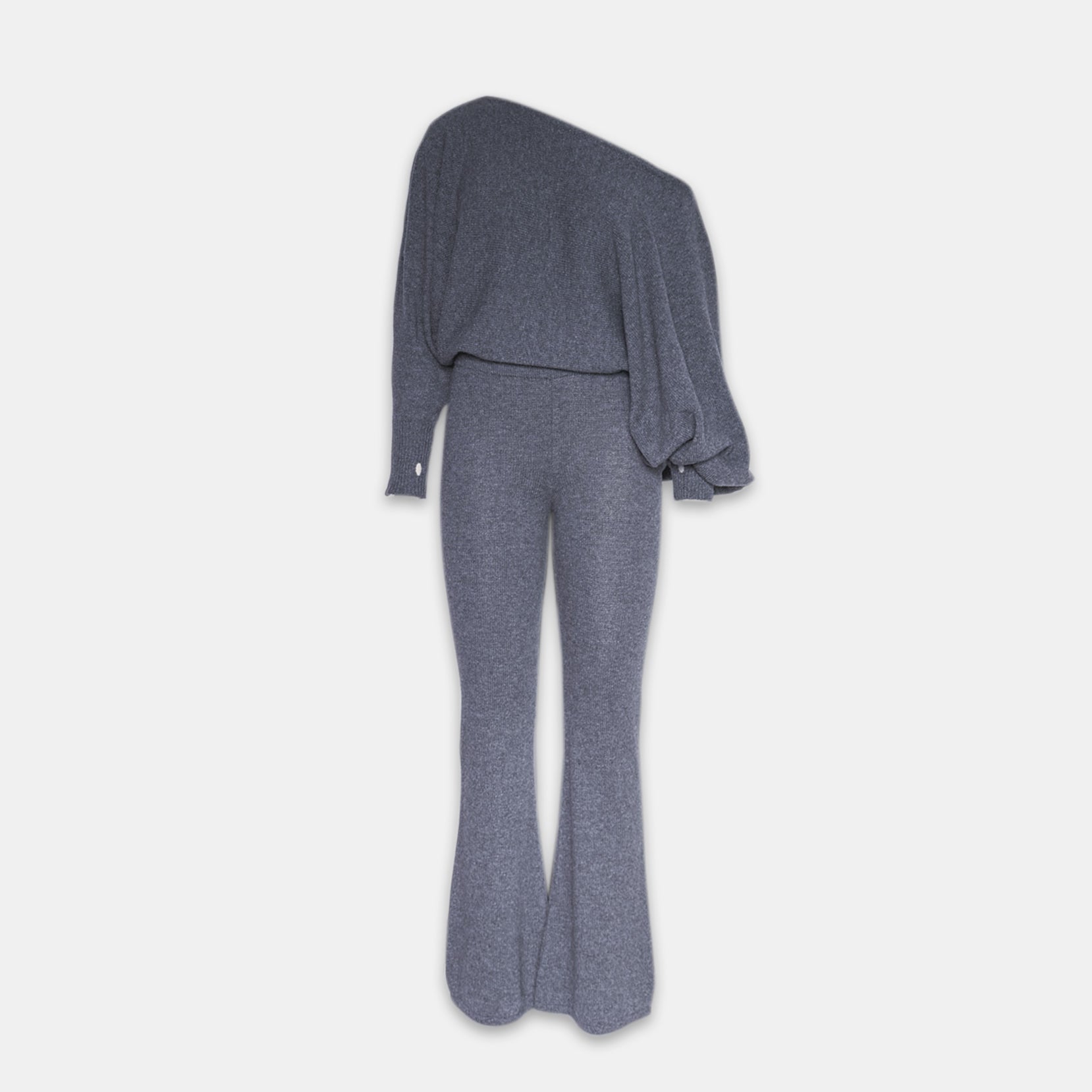 Geniş, akışkan kollarıyla dramatik ve zarif bir üst siluet yaratırken; toparlayıcı formdaki fit pantolonu bedeni kusursuz şekilde takip eder. Minimalist çizgisi, hafif dokusu ve esnek yapısıyla hem şehirde hem evde konforlu şıklığın en güçlü halidir.