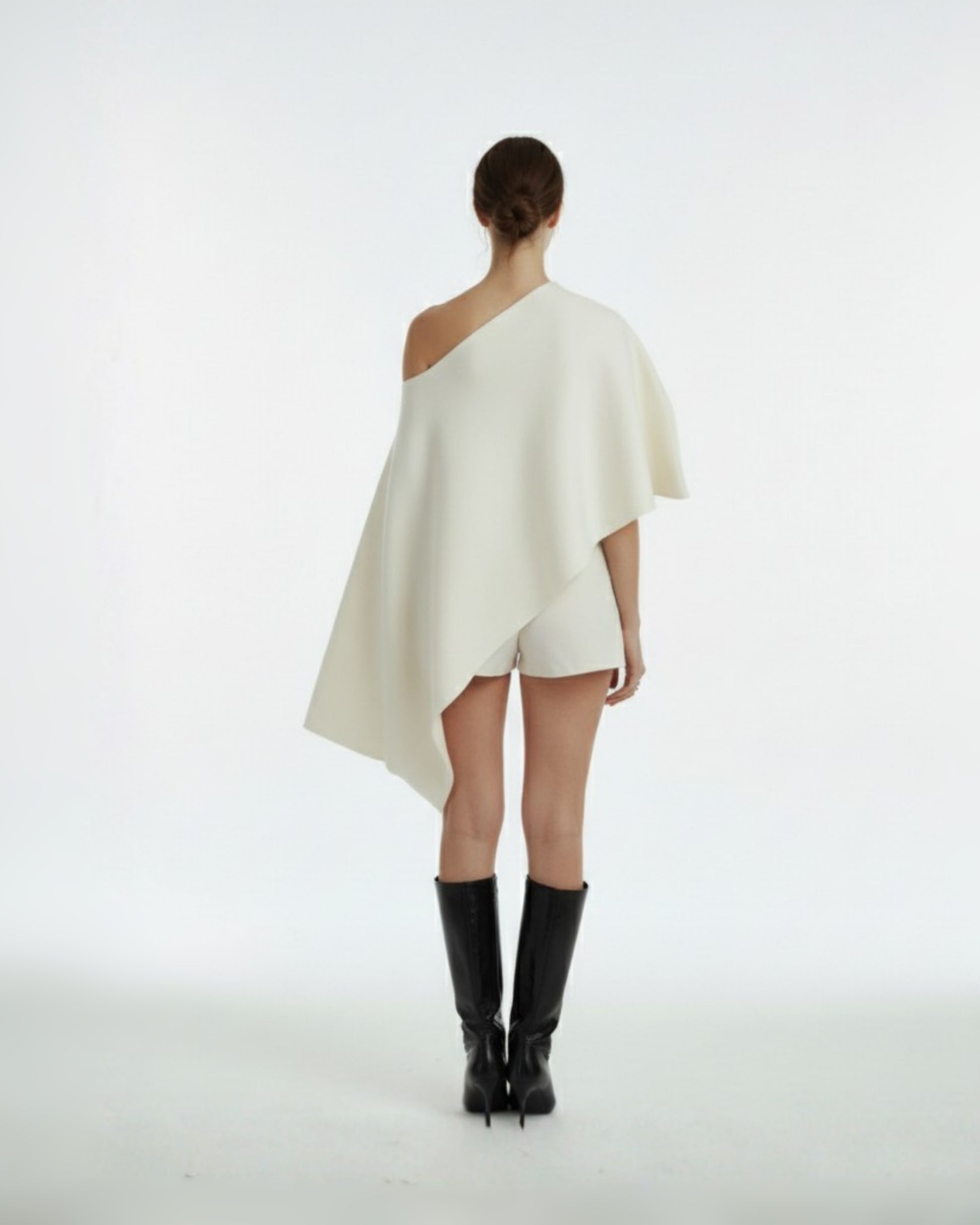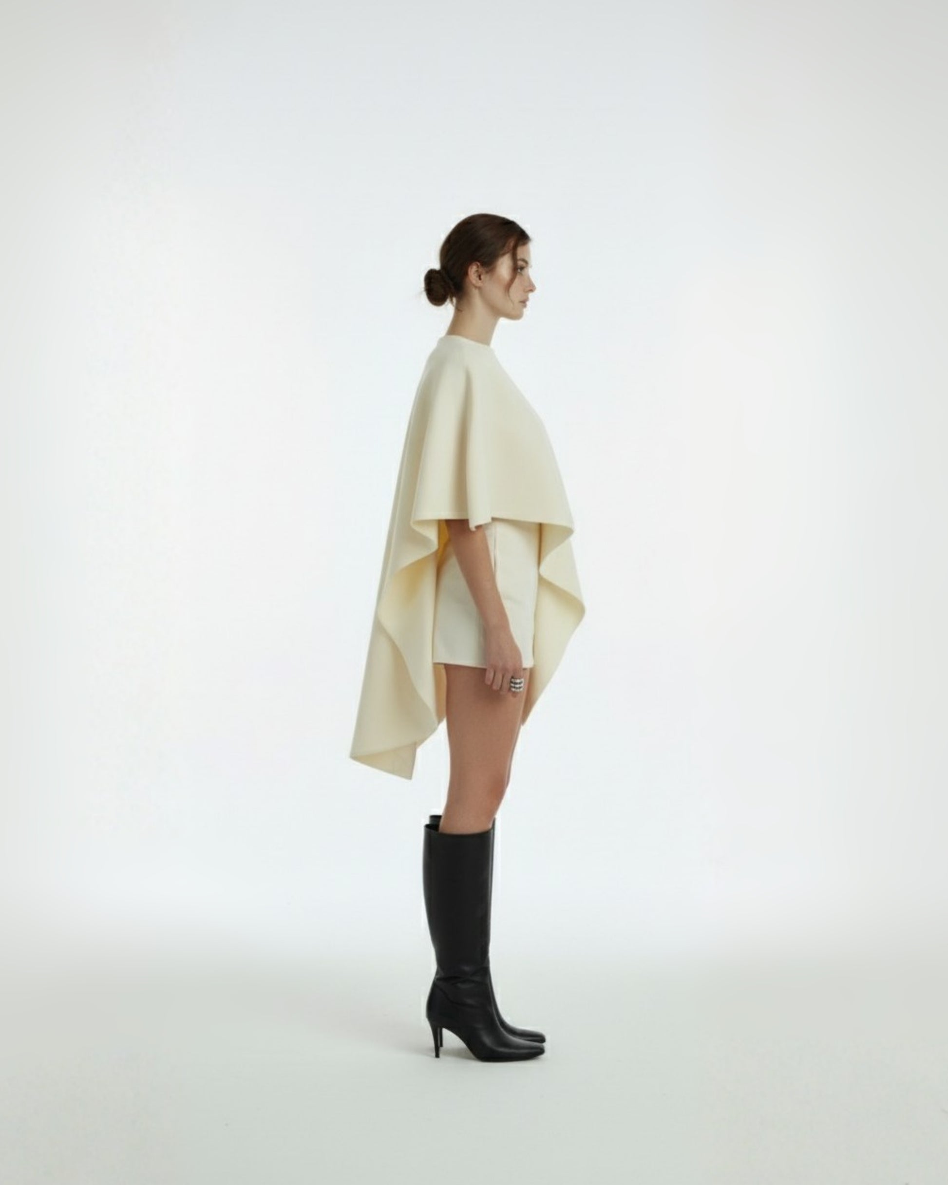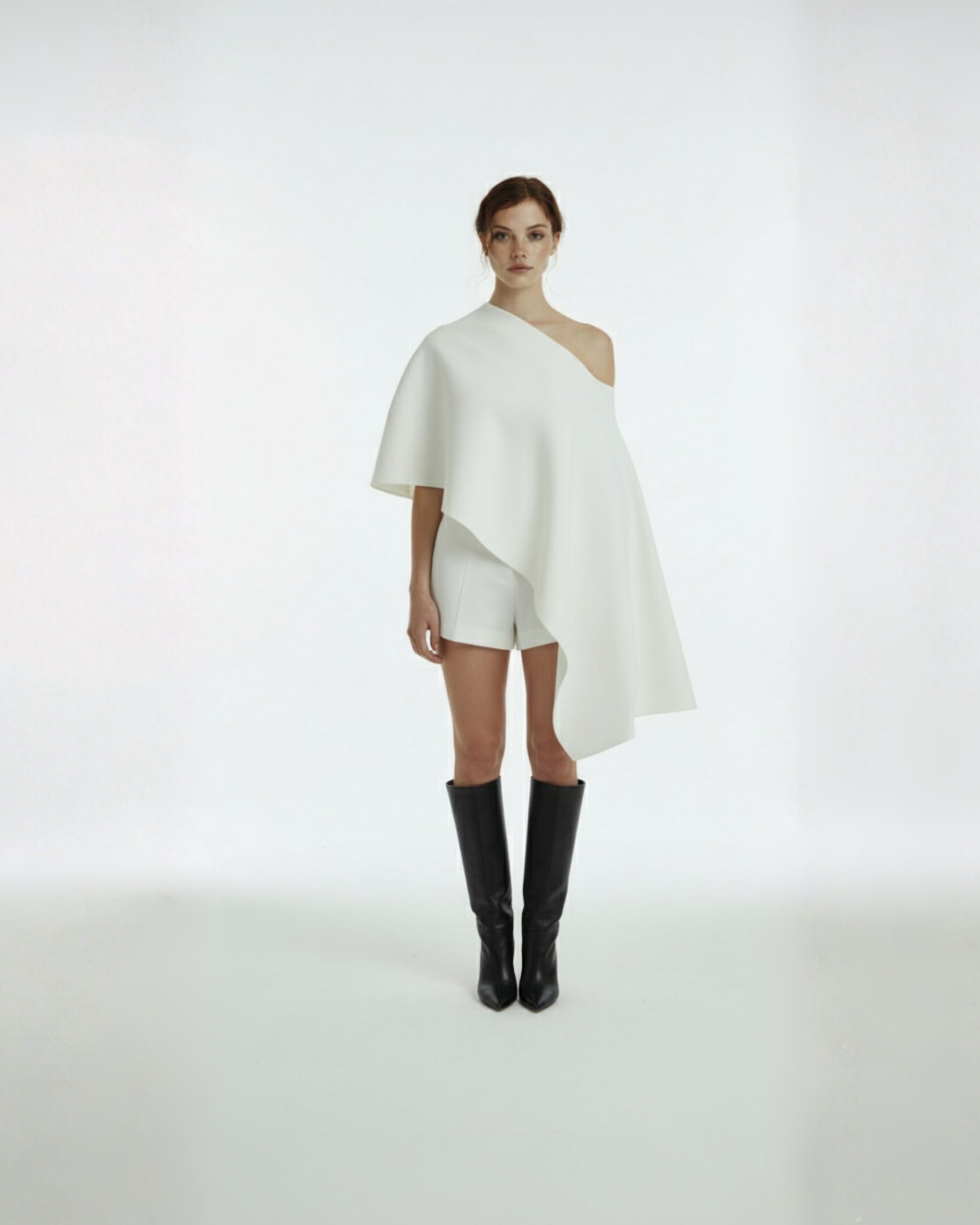 Asimetrik ve akışkan kesimi, omuzdan zarifçe dökülerek heykelsi bir hacim oluşturur. Sade bir pantolonla gündüz şehir stiline, deri çizmelerle gece görünümüne kolayca uyum sağlar.