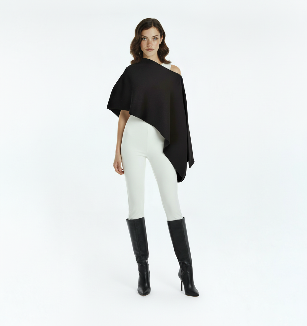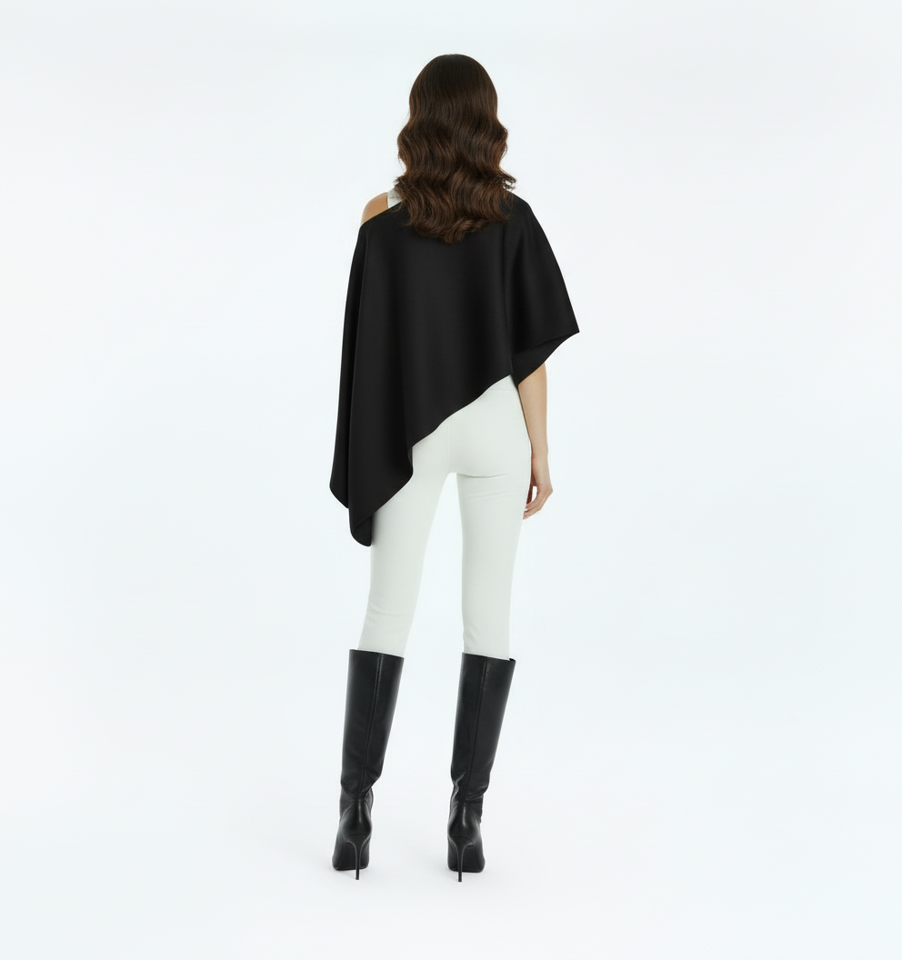 Asimetrik ve akışkan kesimi, omuzdan zarifçe dökülerek heykelsi bir hacim oluşturur. Sade bir pantolonla gündüz şehir stiline, deri çizmelerle gece görünümüne kolayca uyum sağlar.