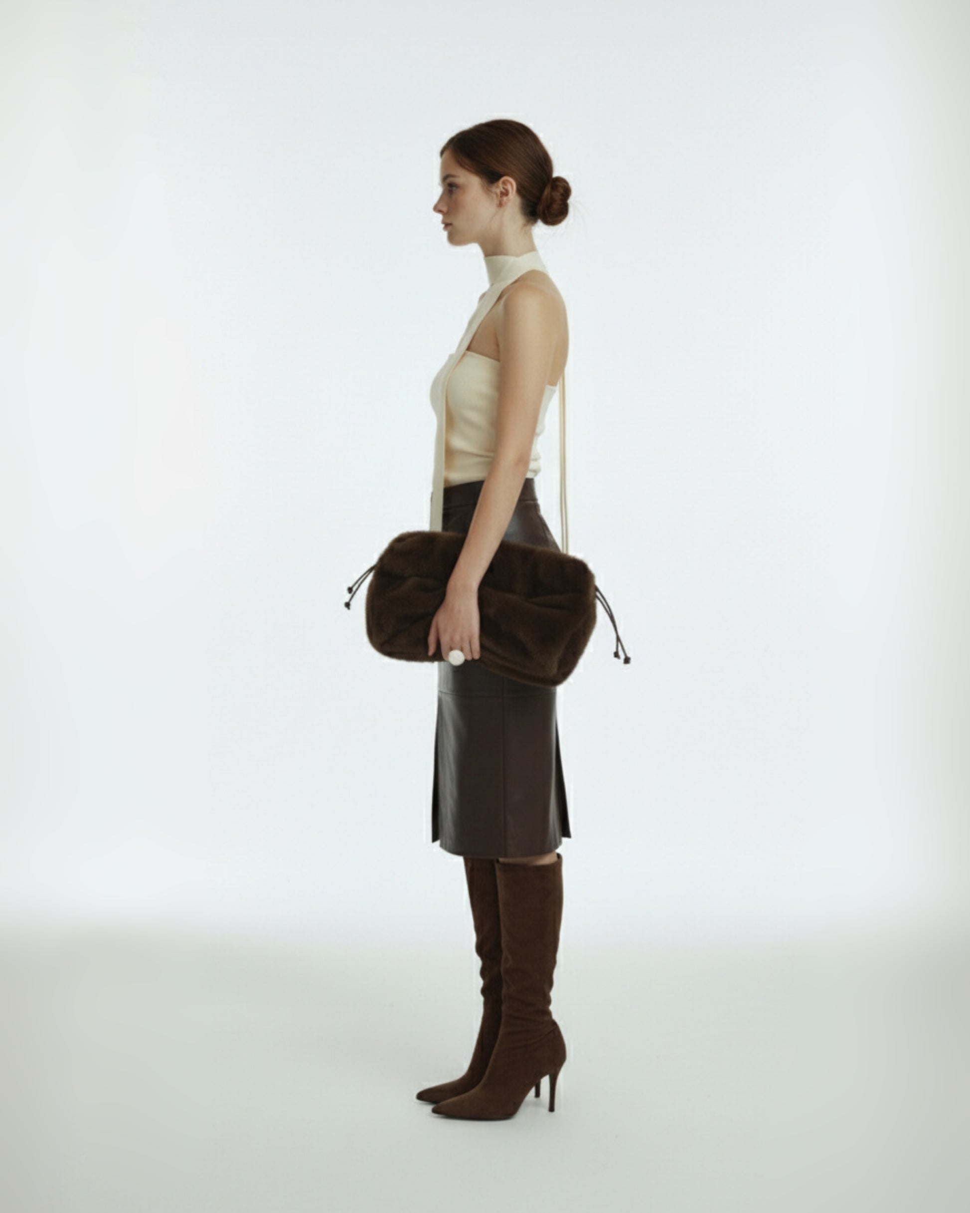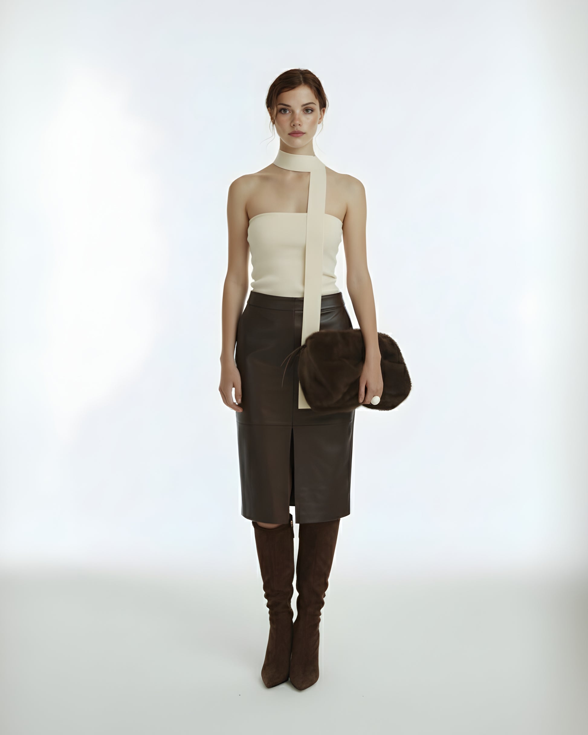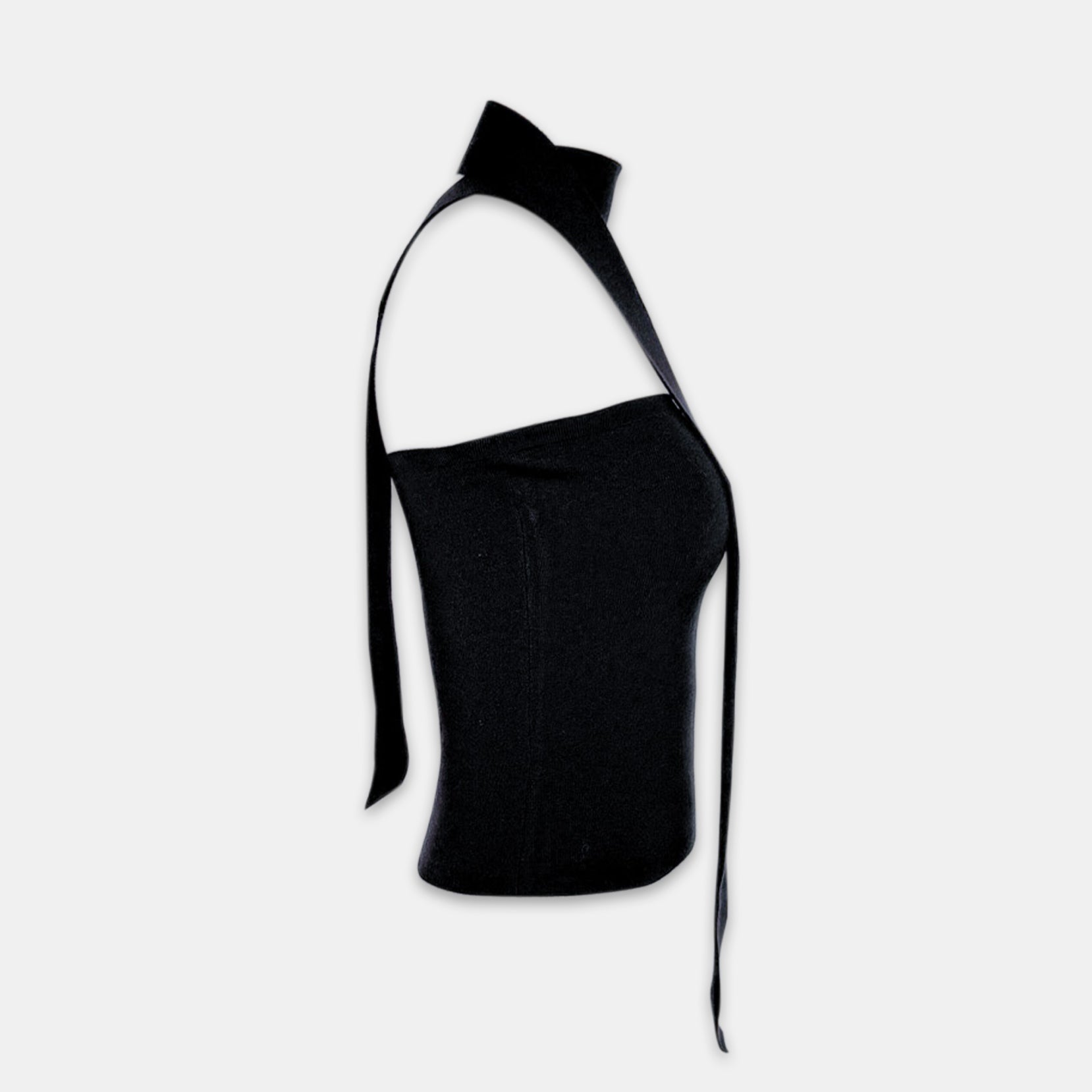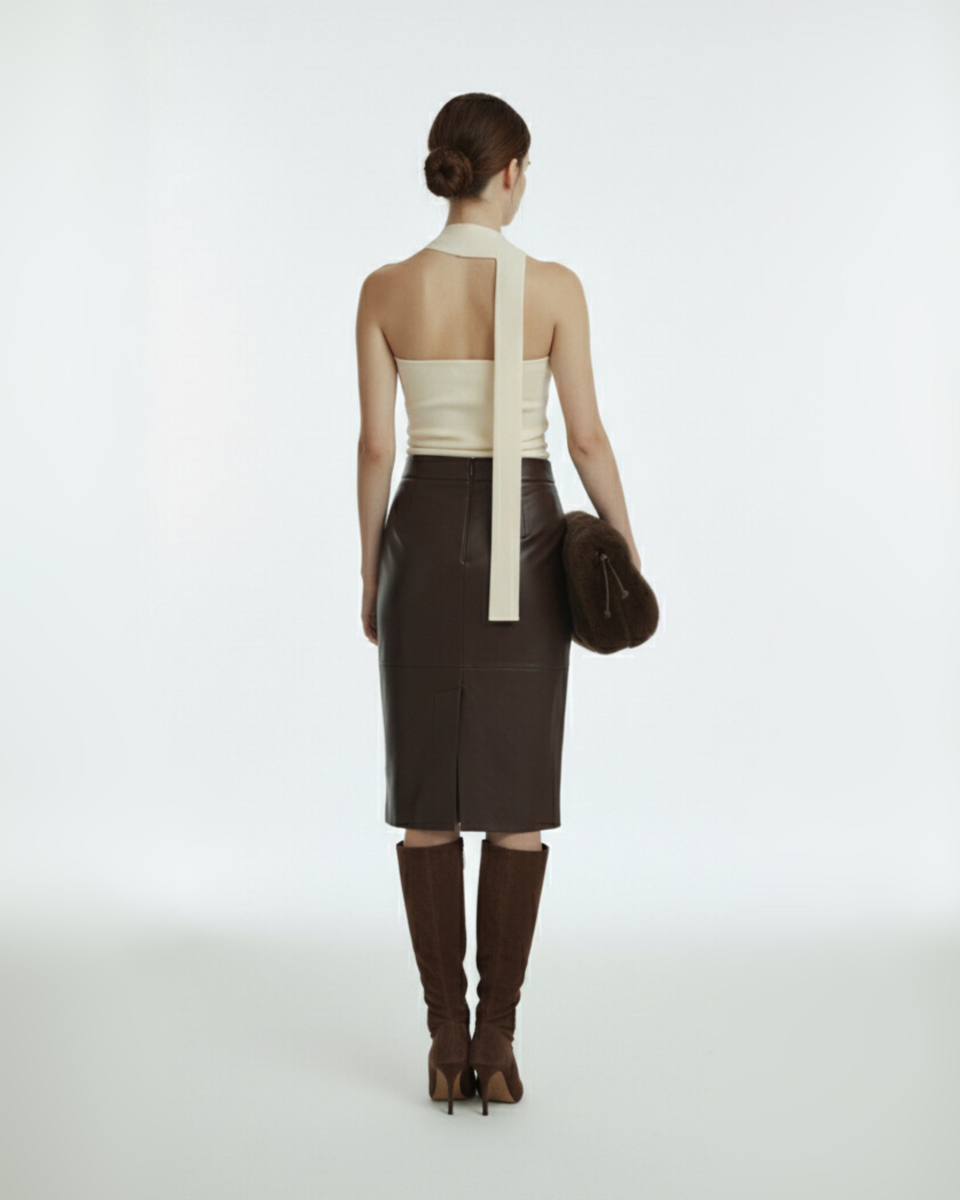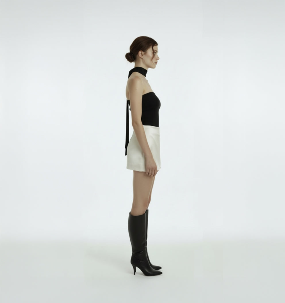 İpeksi rayondan geliştirilen Oleria Top, boyundan bağlanan imza şeridi ve heykelsi formu ile modern, sofistike ve zamansız bir siluet sunar. Bedeni zarifçe saran dokusu, minimal şıklığı güçlü bir ifadeye dönüştürür.